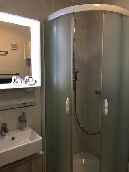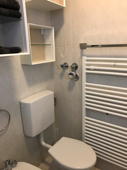 Ein modernes Bad mit Dusche, Bidet, Handtuchheizkörper