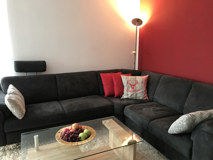 Ein heller Wohn-Essbereich mit Wohnlandschaft, TFT-Fernseher