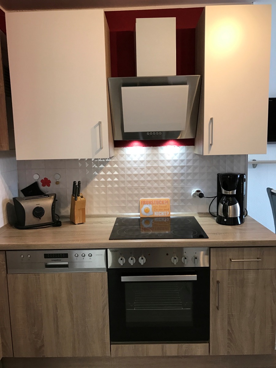 Eine Küche mit Spülmaschine, Cerankochfeld, Backofen mit Heißluft und Grill, Mikrowelle mit Grill und eine Kühl-Gefrierkombination. Die Vielfalt der vorhanden Küchenutensilien lässt kaum Wünsche offen.
